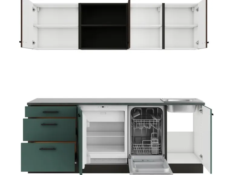 Aufbau- und Montagematerial sind im Lieferumfang enthalten. Die Küchenzeile wird zur Selbstmontage geliefert. Die Arbeitsplatte ist nicht zugesägt.