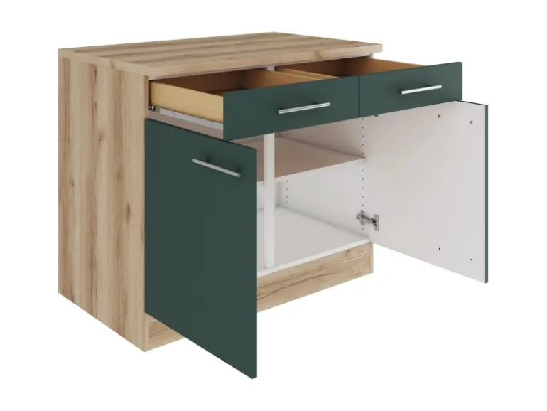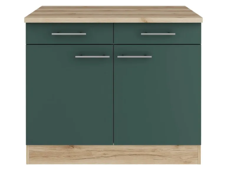 Die Serie Savona405 ist mit der Kombination aus Frontfarbe in Steingrün mit Korpus und Arbeitsplatte in Wildeiche Nachbildung perfekt abgestimmt. Metallgriffe in Edelstahl-Optik runden den Look ab und machen Ihre Küche zu einem echten Hingucker.