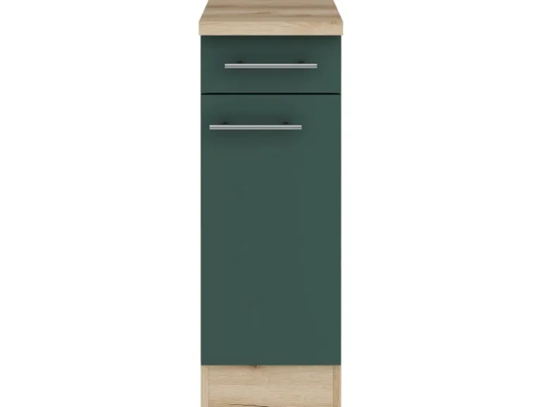 Die Serie Savona405 ist mit der Kombination aus Frontfarbe in Steingrün mit Korpus und Arbeitsplatte in Wildeiche Nachbildung perfekt abgestimmt. Metallgriffe in Edelstahl-Optik runden den Look ab und machen Ihre Küche zu einem echten Hingucker.