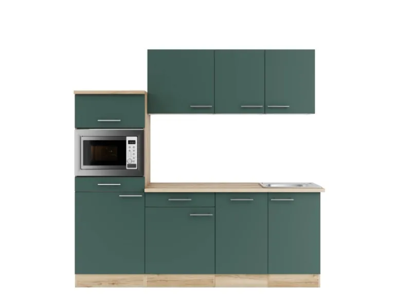 Die Serie Savona405 ist mit der Kombination aus Frontfarbe in Steingrün mit Korpus und Arbeitsplatte in Wildeiche Nachbildung perfekt abgestimmt. Metallgriffe in Edelstahl-Optik runden den Look ab und machen Ihre Küche zu einem echten Hingucker.