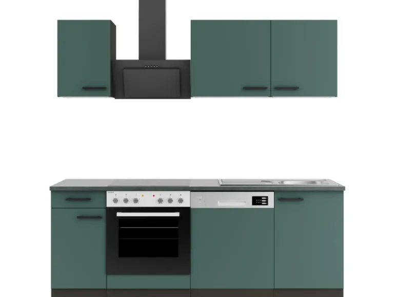 Die Serie Verona405 ist mit der Kombination aus Frontfarbe in Steingrün mit Korpus und Arbeitsplatte in Anthrazit Matt perfekt abgestimmt. Metallgriffe in Schwarz Matt runden den Look ab und machen Ihre Küche zu einem echten Hingucker.