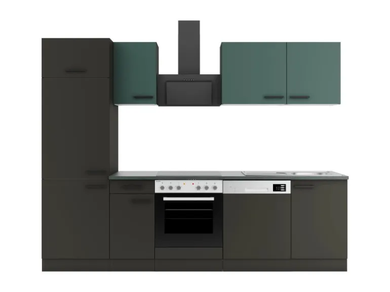 Die Serie Verona405/Madrid420 ist mit der Kombination aus Frontfarbe in Steingrün / Anthrazit Matt mit Korpus und Arbeitsplatte in Anthrazit Matt perfekt abgestimmt. Metallgriffe in Schwarz Matt runden den Look ab und machen Ihre Küche zu einem echten Hingucker.