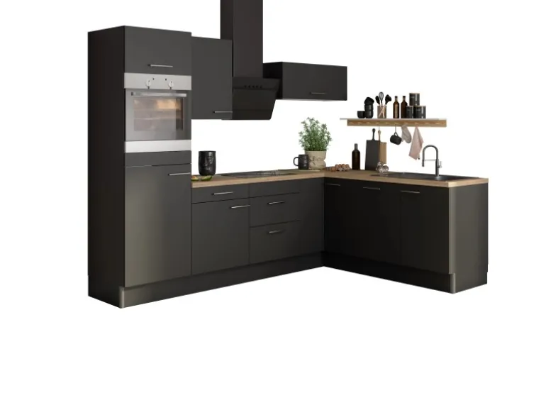 Die Arbeitsplatte in Wildeiche Nachbildung passt farblich fantastisch zu der Front- und Korpusfarbe Anthrazit. Die matten Fronten schließen mit den enthaltenen Griffen in Metall Edelstahl Optik den modernen Look der Küche ab.