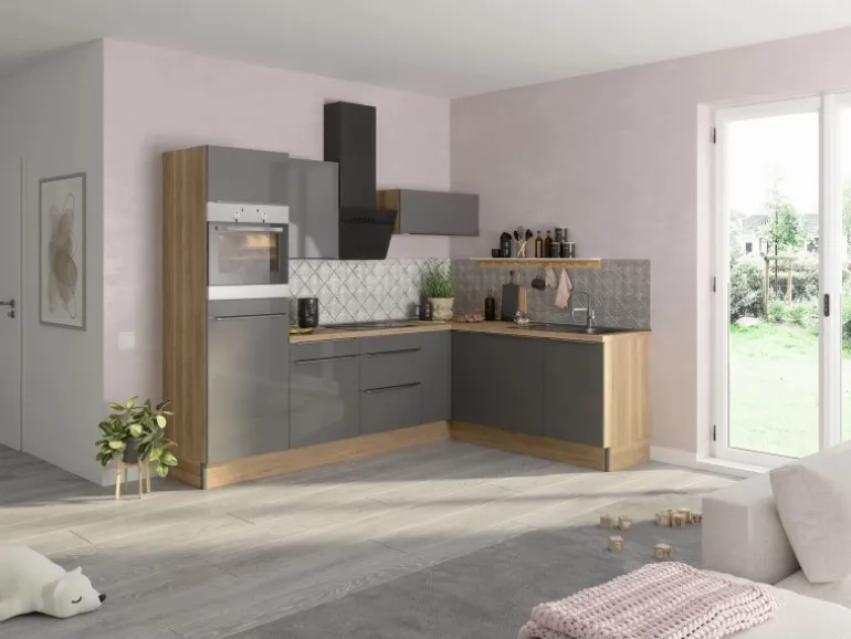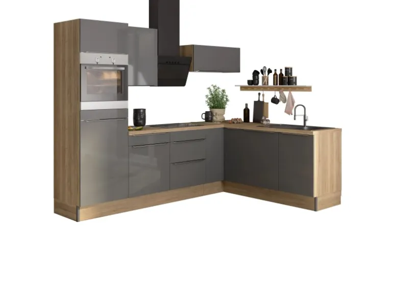 Die Arbeitsplatte und die Korpusfarbe in Wildeiche Nachbildung ist farblich fantastisch zu der Frontfarbe in Anthrazit Lack Glanz abgestimmt. Mit den enthaltenen Griffleisten in Metall Edelstahl Optik schließt die Front- Korpuskombination den modernen und frischen Look der Küche ab.