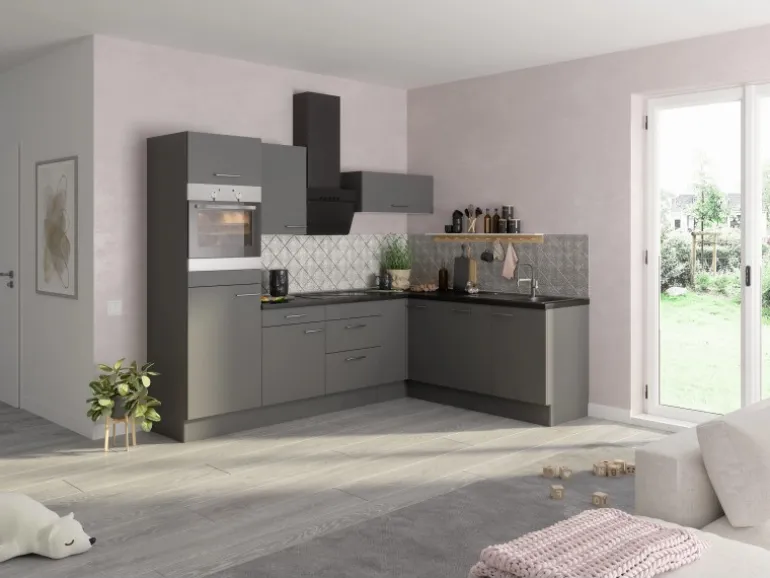 Die Front- und Korpusfarbe Basaltgrau passt farblich hervorragend zu der Arbeitsplatte in Black Stone. Die Farbkombination rundet den modernen Look mit den enthaltenen Griffen in Metall Edelstahl Optik perfekt ab.