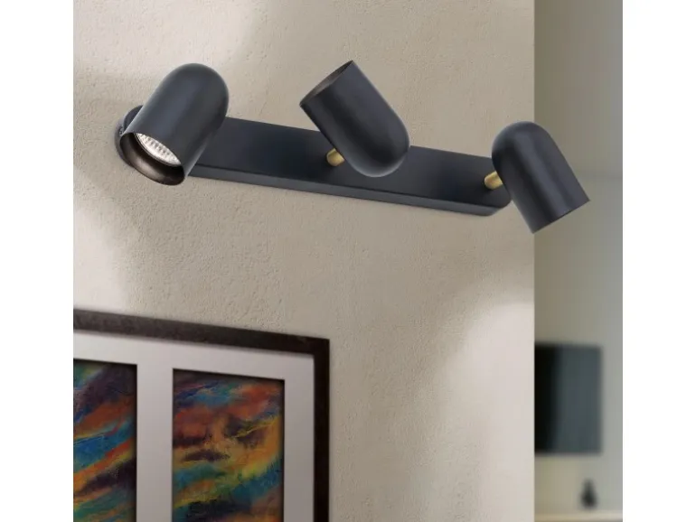 Mattes Schwarz und glänzendes Gold – diese trendige Farbkombination charakterisiert den dreiflammigen Strahler BRADLEY und verleiht ihm sein elegantes Erscheinungsbild.Die Leuchtenköpfe sind dreh- und schwenkbar und lassen sich einfach in die gewünschte Position bringen, um gewisse Wohnbereiche durch Akzentbeleuchtung hervorzuheben. So kann der dreiflammige Aufbaustrahler zur Beleuchtung von Bilderrahmen im Wohnzimmer, der Garderobe im Vorraum oder der Kücheninsel eingesetzt werden.Ausgestattet mit GU10-Fassungen kann diese Leuchte mit langlebigen LED-Reflektorlampen kombiniert werden, die auch im Dauerbetrieb wenig Wärme entwickeln und energiesparend sind.