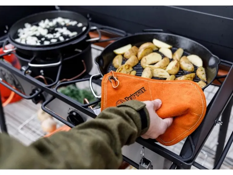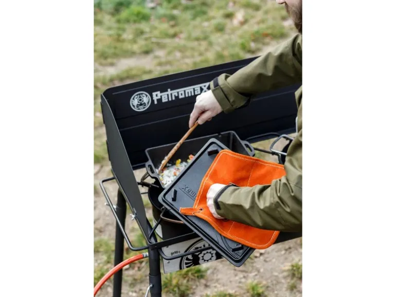 Mit den Aramid Topflappen schützt du dich und deine Hände auch bei hitzigsten Draußen-Kochabenteuern zuverlässig. Das mit Aramidfasern gefütterte Rauleder hält bei zu einer Kontaktwärme von bis zu 250 °C problemlos Stand und sorgt für einen festen Griff an deinen Feuertöpfen und -pfannen. Auch ein zwischenzeitliches Abstellen deiner Kochutensilien ist auf einer Fläche von 25,5 x 25,5 cm möglich. In glühendem Petromax-Orange mit dem Drachenlogo der deutschen Traditionsmarke ergänzen die Aramid Topflappen deine Draußen-Kochausrüstung um eine funktionale wie optisch starke Ausstattung. Natürlich kannst du die Topflappen auch am heimischen Herdfeuer zum Einsatz bringen.