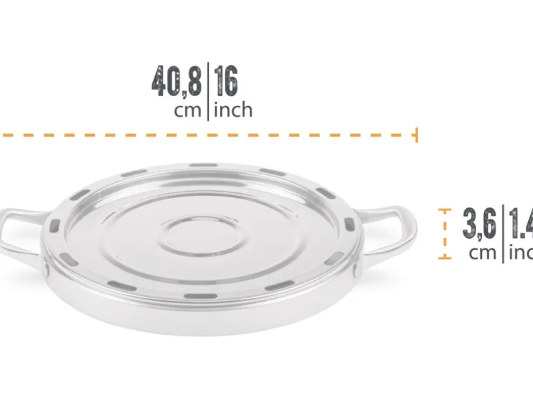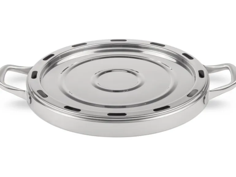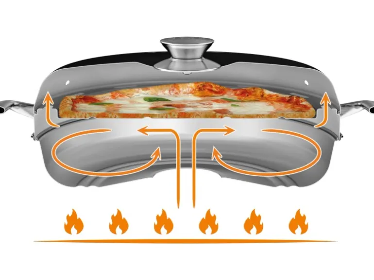 Rundes Pizzablech aus Edelstahl in Kombination mit dem Camping Backofen: zwei Gerichte gleichzeitig kochen