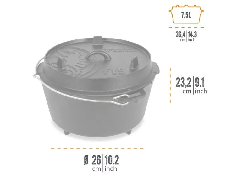 Du kannst den Bräter auf offenem Feuer, auf der Glut, dem Grill, im Atago, im Backofen oder auf einem normalen Herd nutzen. Im offenen Feuer ist der Topf am besten von Kohle umhüllt. Mithilfe der kleinen Standfüße kannst du den Schmortopf direkt ins Feuer oder in die Glut stellen. Der Dutch Oven kann aber auch direkt in das Feuer oder die Glut gestellt oder an ein Dreibein über die Feuerstelle gehängt werden. Der Deckel lässt sich als Pfanne nutzen und verfügt über einen hohen Rand, damit Kohle oder Briketts nicht herunterfallen.