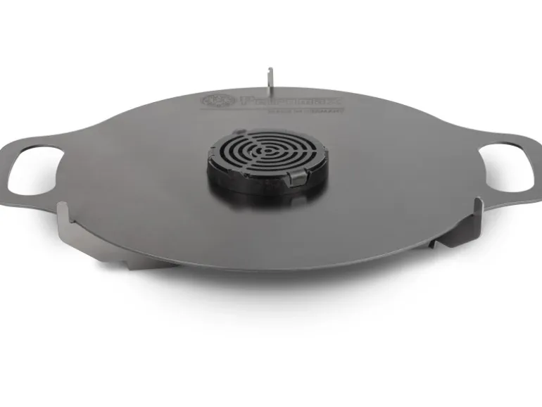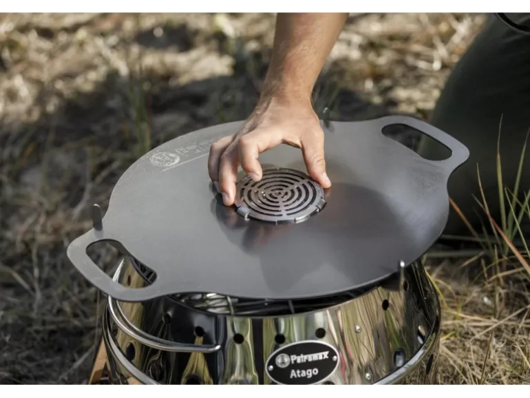 Mit einer Grill- und Kohlenzange kannst du den Einsatz einfach vom Kochaufsatz oder aus der Atago Grillplatte heben. Anschließend füllst du Kohle oder Holz durch die Aussparung in der Mitte der Platte oder des Kochaufsatzes nach. Der Petromax Einsatz erweitert die Atago Plancha-Grillplatte um eine zusätzliche Möglichkeit, auf der Grillplatte zu kochen und ermöglicht dir die Zubereitung von sicher platziertem Grillgut mit typischen Grillstreifen.