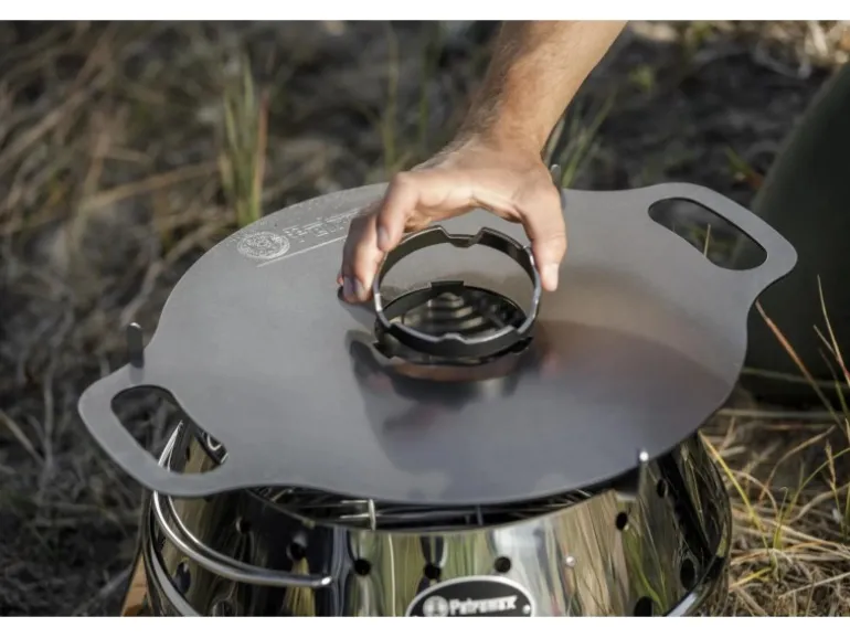 Der Kochaufsatz fügt sich genau in die Aussparung deiner Grillplatte ein und sorgt dafür, dass das Grillgut sicher auf der Platte bleibt. Darüber hinaus dient der Aufsatz für direkten Flammenkontakt zur Zubereitung von Saucen, Suppen, Pfannengerichten oder Kaffee, während deine stärkende Mahlzeit auf der Atago Grillplatte brutzelt. So hast du mit einem kleinen Feuertopf, Saucentopf oder einer Kasserolle die Möglichkeit, eine Grillsauce, eine deftige Vorsuppe oder eine würzige Beilage zuzubereiten. Anschließend kannst du mit dem Perkolator einen aromatischen Kaffee kochen oder mit der kleinen Teekanne einen Wildkräutertee.