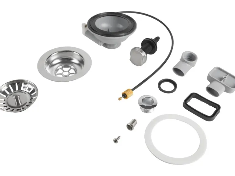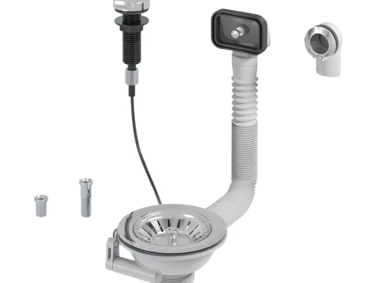 Robustes Kunststoffmaterial mit verchromtem Auffangsieb und Exzenterstopfen