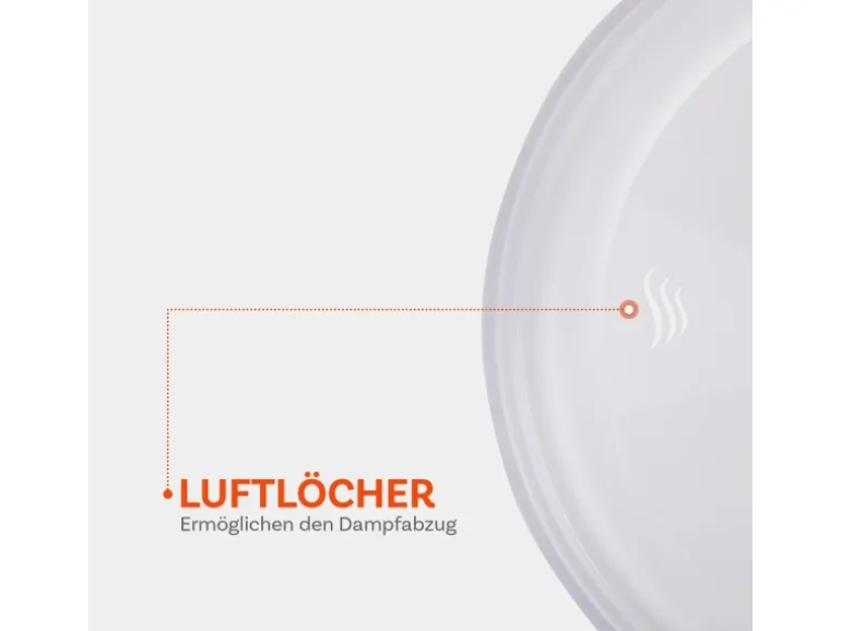 Mit unserer transparenten Mikrowellenabdeckung können Sie Lebensmittel ohne Sorgen vor Spritzern und Verschmutzungen erwärmen. Das intelligente Design verhindert, dass heiße Flüssigkeiten oder Lebensmittelreste Ihre Mikrowelle verschmutzen, was die Reinigung erheblich vereinfacht und Ihnen Zeit und Mühe spart. Genießen Sie sauberes und hygienisches Kochen, ohne die lästige Reinigung hinterher.
