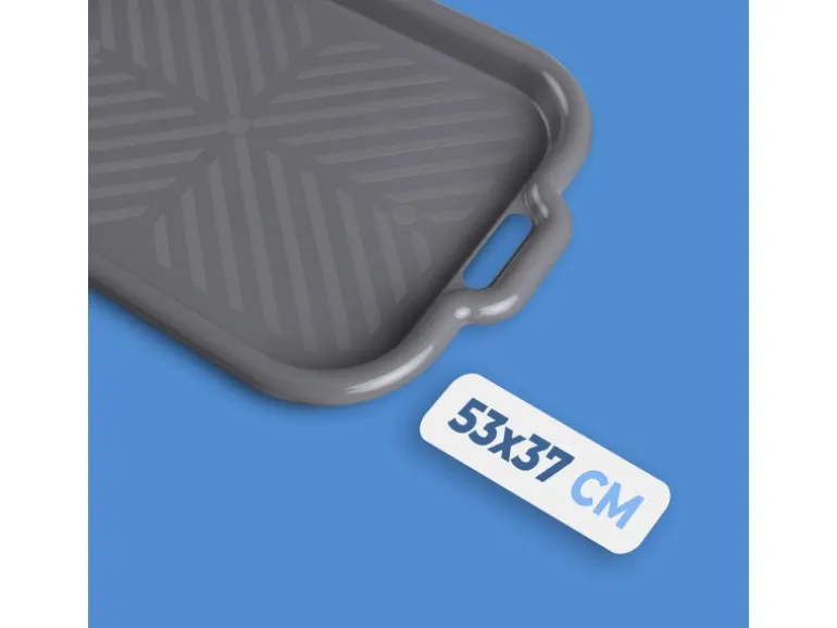 Produktmerkmale:Hoher Rand für Sicherheit: Mit einem hohen Rand von 3 cm bietet das Tablett einen sicheren Halt für Gläser, Teller und andere Gegenstände, sodass nichts verrutschen oder verschütten kann.Platzsparend stapelbar: Dank seines durchdachten Designs ist das Tablett platzsparend stapelbar. Dies ermöglicht eine effiziente Aufbewahrung, selbst in kleinen Küchen.Einfache Reinigung: Die glatte Oberfläche des Tabletts lässt sich mühelos mit einem feuchten Tuch reinigen. So bleibt es stets hygienisch und einsatzbereit.Schlichte Farben und minimalistisches Design: Erhältlich in dezenten Farben, fügt sich das Tablett harmonisch in jede Kücheneinrichtung ein. Das minimalistische Design sorgt für zeitlose Eleganz.Ablagestruktur für sicheren Halt: Die spezielle Ablagestruktur bietet zusätzliche Stabilität und verhindert das Verrutschen von Gegenständen. Dies sorgt für einen sicheren Transport, auch wenn das Tablett voll beladen ist.Praktische Griffe: Ausgestattet mit praktischen Griffen an den Seiten, ermöglicht das Tablett einen sicheren und komfortablen Transport von Speisen und Getränken.Zwei Größen verfügbar: Wählen Sie zwischen zwei praktischen Größen – 45x33x3 cm und 53x37x3 cm – je nach Ihren individuellen Bedürfnissen und Vorlieben.