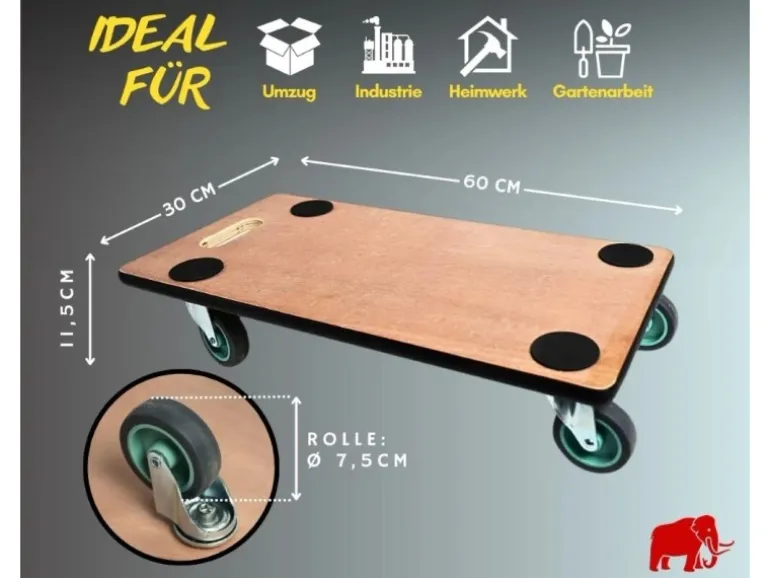 Die kompakten Abmessungen unserer Profi Transportroller machen sie äußerst vielseitig einsetzbar. Mit einer Höhe von 11,5 cm, einer Breite von 30 cm und einer Tiefe von 60 cm passen sie problemlos durch enge Durchgänge und Türöffnungen. Die 4 Lenkrollen aus thermoplastischem Gummi, die sich um 360 Grad drehen lassen, bieten eine optimale Manövrierfähigkeit, um auch in engen Räumen problemlos zu navigieren.