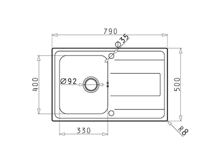 Ausgestattet ist die Spüle mit einem 92-mm-Drehexcenter (3 1/2″), einem Überlauf im Becken und zwei Hahnlöchern. Befestigungsmaterial sowie die Ab- und Überlaufgarnitur sind im Lieferumfang enthalten.