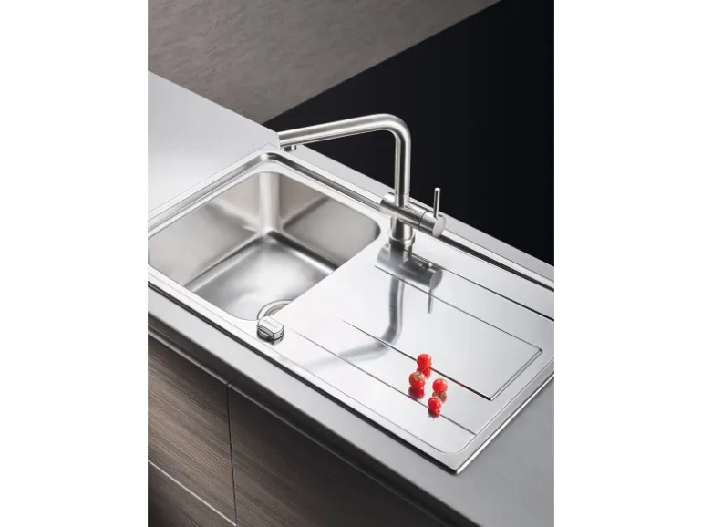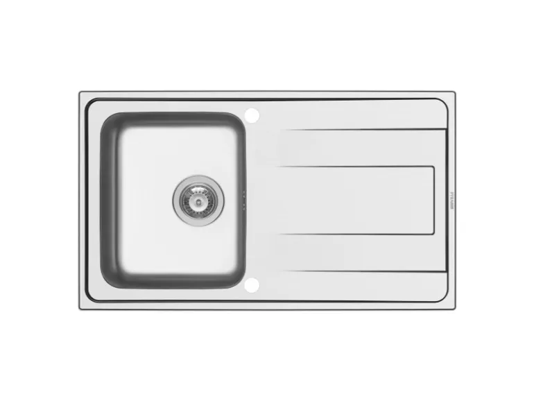 Dank der kompakten Außenmaße und der kleinen Abtropffläche nimmt die Spüle nur wenig Platz auf der Arbeitsplatte ein und passt in Unterschränke ab einer Breite von 45 cm.