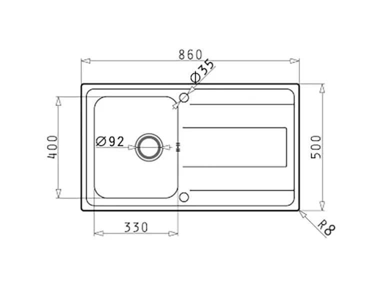 Die Spüle ist mit einem 92-mm-Drehexcenter (3 1/2″), einem Überlauf im Becken und zwei Hahnlöchern ausgestattet. Befestigungsmaterial sowie die Ab- und Überlaufgarnitur sind im Lieferumfang enthalten.