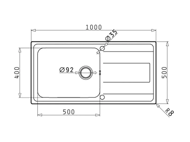 Das Modell erfordert einen Unterschrank mit einer Breite von mindestens 60 cm. Die Spüle ist mit einem 92-mm-Drehexcenter (3 1/2″), einem Überlauf im Becken und zwei Hahnlöchern ausgestattet.