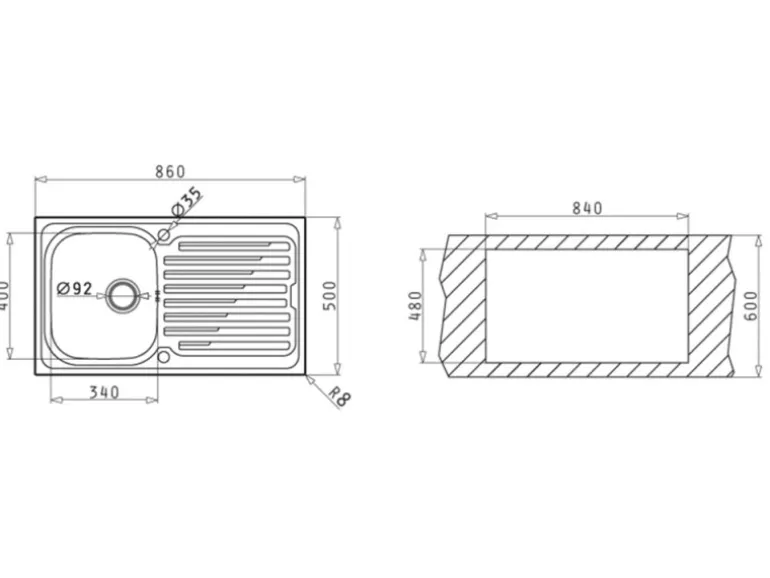 Spülenmaß: 86 cm x 50 cm x 18 cm