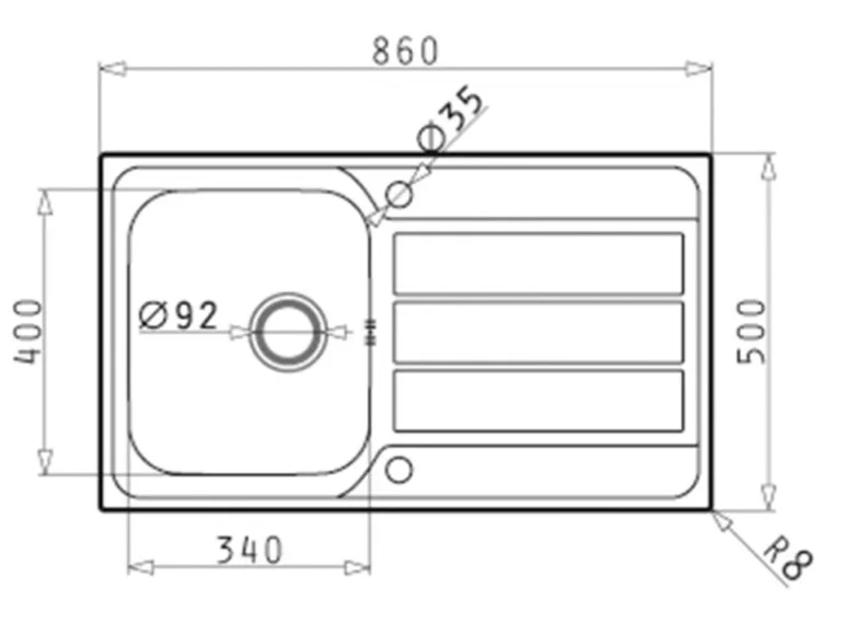 Spülenmaß: 86 cm x 50 cm x 18 cm