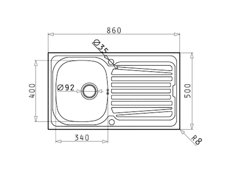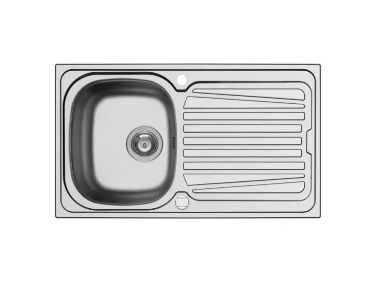 Mit ihren kompakten Außenmaßen und der kleinen Abtropffläche nimmt die Spüle nur wenig Platz auf der Arbeitsplatte ein und passt bereits in Unterschränke ab 45 cm Breite.