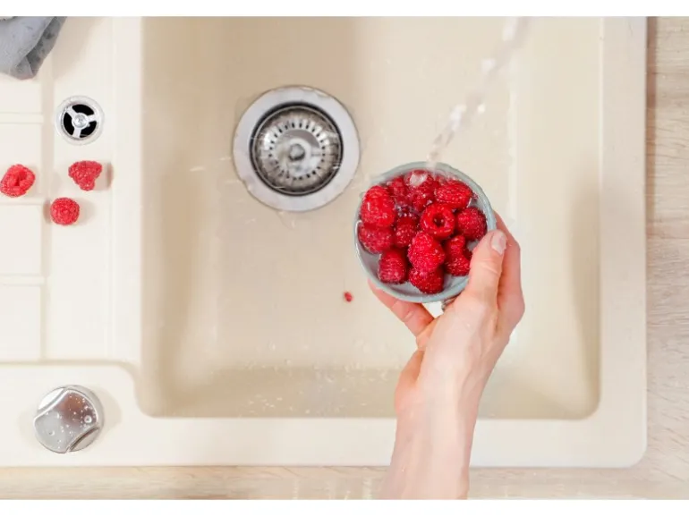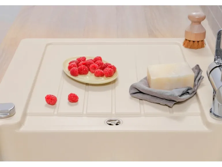– Umlaufend erhöhter Rand hält Wasser und Schmutz im Spülbereich