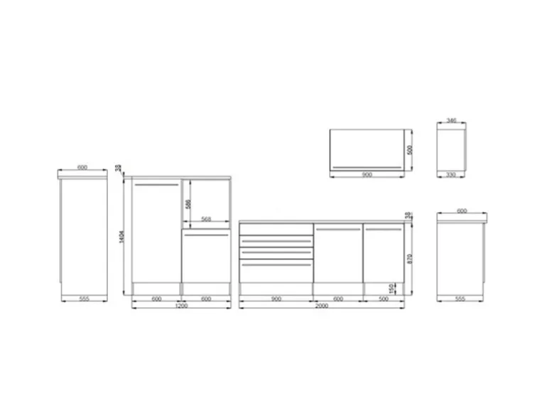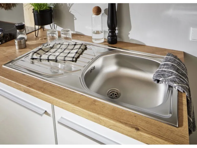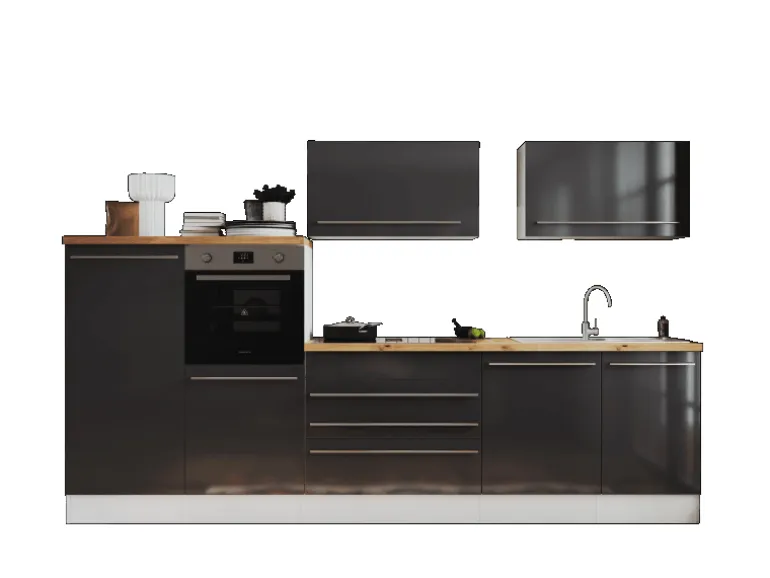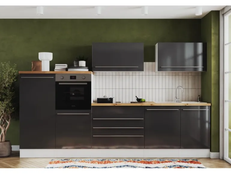 Die Küchenzeile mit Geräten kann nach Wunsch und Bedarf wechselseitig aufgebaut werden. Mithilfe der detaillierten Aufbauanleitung gestaltet sich die Montage der modernen Küche besonders einfach.