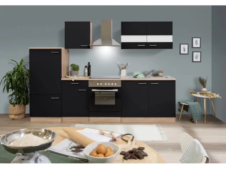 Die Küche bietet dank der Kombination von Hänge- und Unterschränken viel Stauraum für verschiedene Küchenutensilien. Die Küchenzeile ist mit einer Länge von 2,70 m optimal für kleine Küchen geeignet und sorgt für eine optimale Nutzung des gegebenen Raums. Die hochwertige Ausstattung sowie die intuitive Anordnung der Geräte sorgen für einen hohen Arbeitskomfort und optimieren verschiedenste Arbeitsvorgänge beim Kochen.