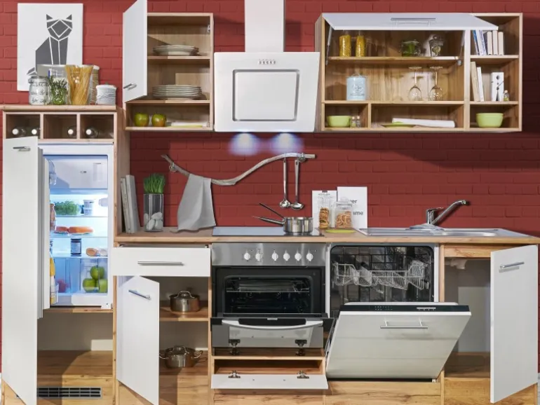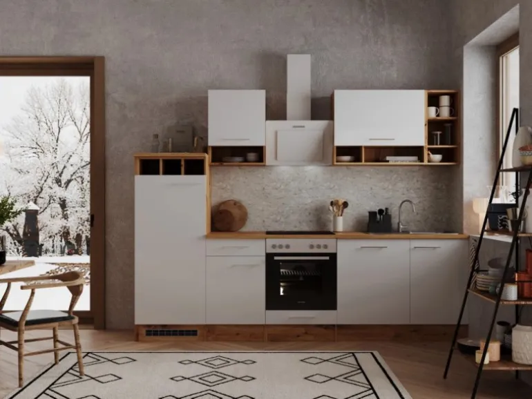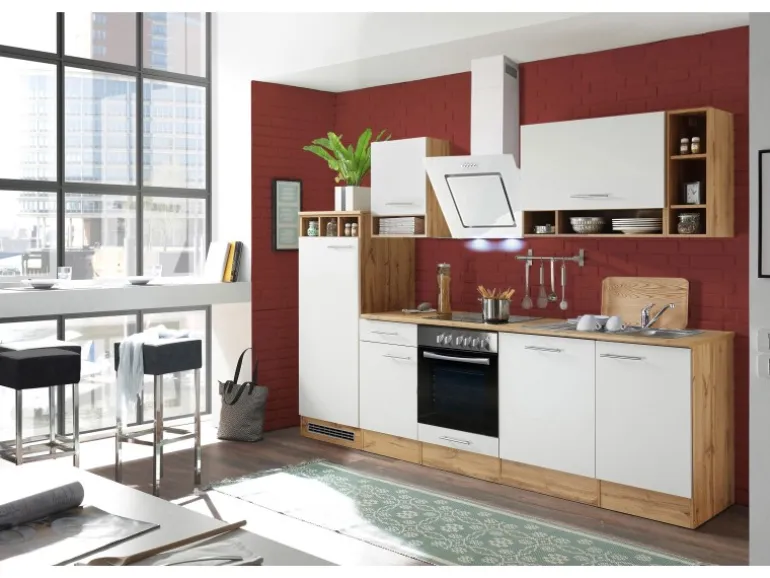Die Respekta Küchenzeile ist mit einer Breite von 280 cm perfekt für mittlere Räume und eignet sich ideal für Familien. Bestehend aus unter anderem je einem 50 cm und einem 80 cm breiten Hängeschrank, einem Herdumbauschrank mit Klapptür und einem Unterschrank mit Schublade bietet diese Küche ausreichend Platz für all Ihre Küchenutensilien.