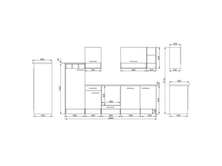 Die Respekta Küchenzeile besteht aus (H x B x T):