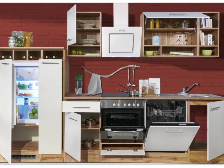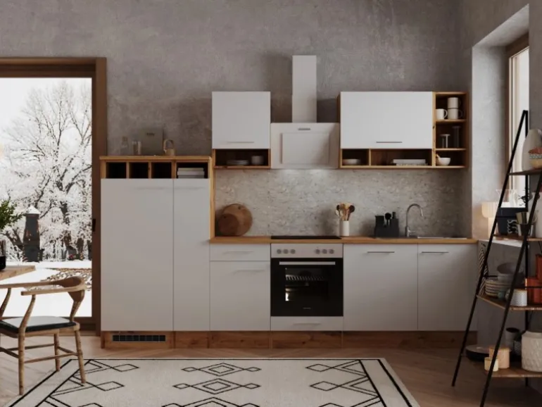 Die Respekta Küchenzeile ist mit einer Breite von 310 cm ideal für Familien. Bestehend aus unter anderem je einem 50 cm und einem 80 cm breiten Hängeschrank, einem Herdumbauschrank mit Klapptür und einem Unterschrank mit Schublade bietet diese Küche ausreichend Platz für all Ihre Küchenutensilien. Ein besonderes Highlight dieser Küche ist der trendige Apothekerschrank. Er ist von beiden Seiten zugänglich und wirkt wie ein kleines Raumwunder. Mit einer Breite von 30 cm und drei Innenfächern schafft er viel übersichtlichen Stauraum für Ihre Vorräte.