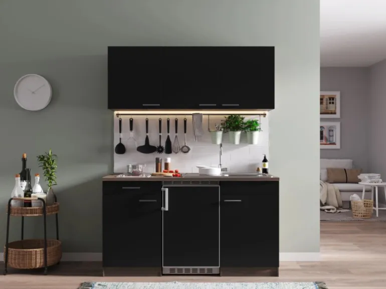 Drei Oberschränke sowie Unterschränke und Schubladen bieten viel Stauraum für Ihre Küchenutensilien und Vorräte. Das Domino-Kochfeld mit zwei Kochzonen, ein Einbaukühlschrank mit drei Sterne Gefrierfach und die Edelstahl Einbauspüle machen die Küchenzeile zum geschmackvollen und funktionellen Einrichtungselement auf kleinem Raum.