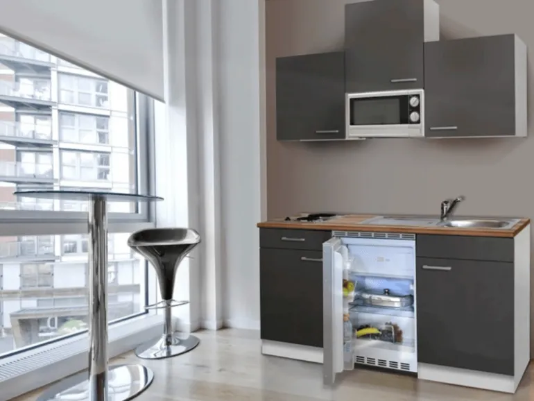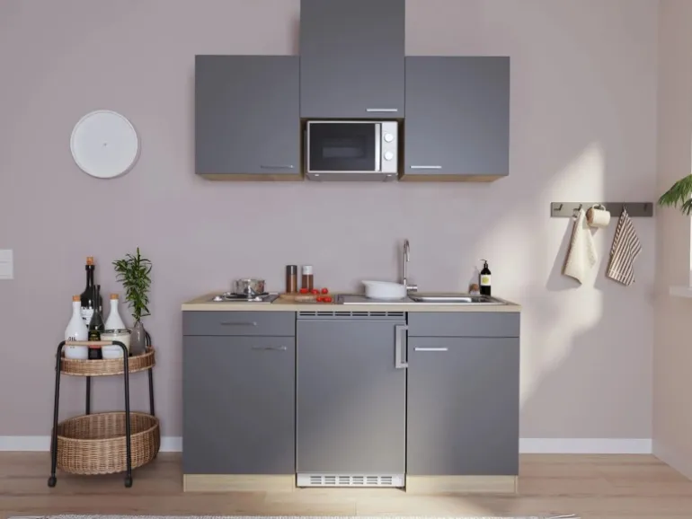 Mit einer Gesamtbreite von 150 cm ist die Küche ideal für das Büro, die Single- oder Studentenwohnung. Der Unterschrank mit Schublade und die drei Oberschränke bieten genügend Platz für Gläser und Geschirr.