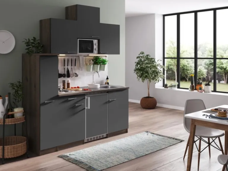 Der Apothekerschrank, drei Oberschränke sowie Unterschränke und Schubladen bieten viel Stauraum für Ihre Küchenutensilien und Vorräte. Das Domino-Kochfeld mit zwei Kochzonen, ein Einbaukühlschrank mit drei Sterne Gefrierfach und die Edelstahl Einbauspüle machen die Küchenzeile zum geschmackvollen und funktionellen Einrichtungselement auf kleinem Raum.