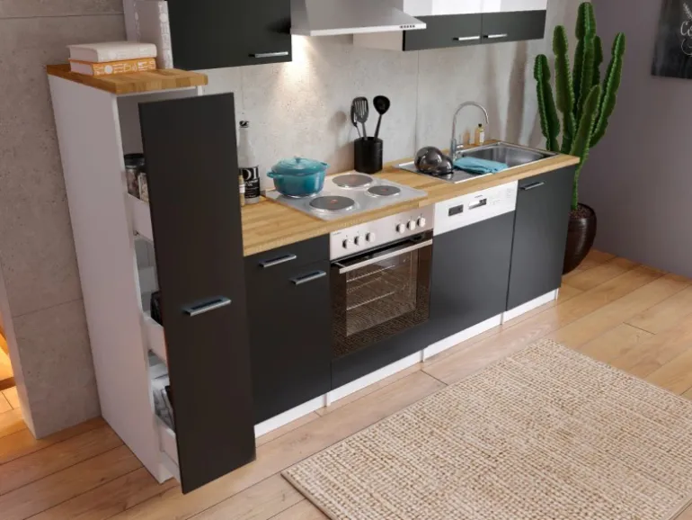 Ein besonderes Highlight dieser Küche ist der trendige Apothekerschrank. Er ist von beiden Seiten zugänglich und wirkt wie ein kleines Raumwunder. Mit einer Breite von 30 cm und drei Innenfächern schafft er viel übersichtlichen Stauraum für Ihre Küchenutensilien und Vorräte.