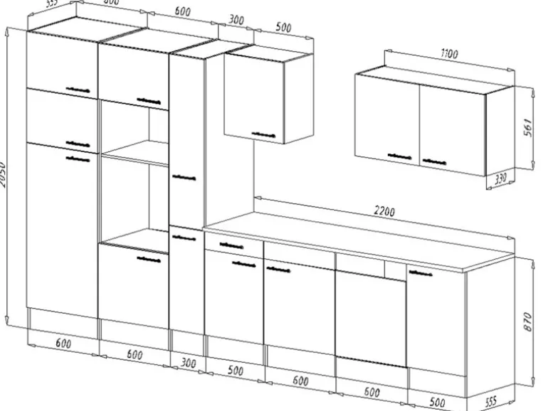 1 Hochschrank für Backofen und Mikrowelle: 205 cm x 60 cm x 55,5 cm