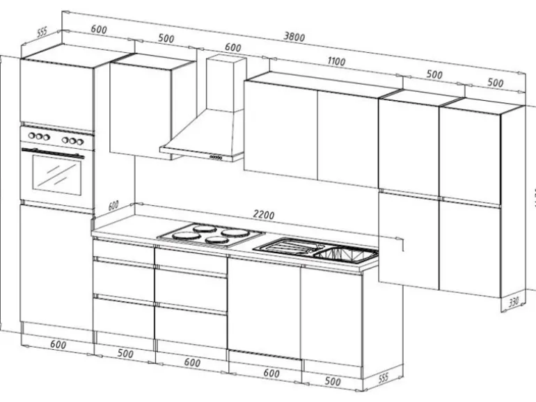 1 Hochschrank für Kühlschrank und Backofen: 220,5 cm x 60 cm x 60 cm