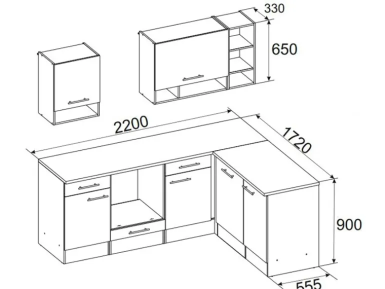 – 1 Eckunterschrank mit Schublade, davon ca. 98 cm Nutzfläche 110 cm