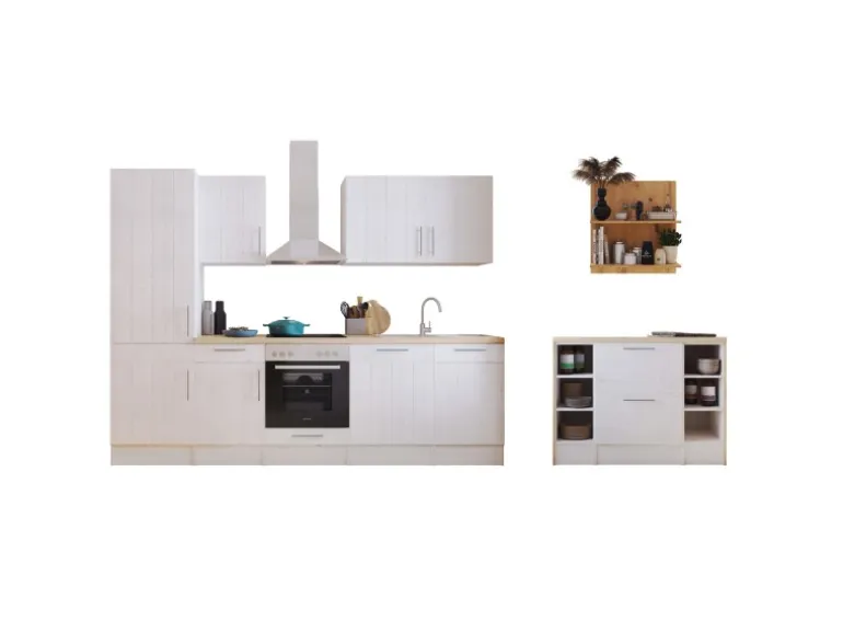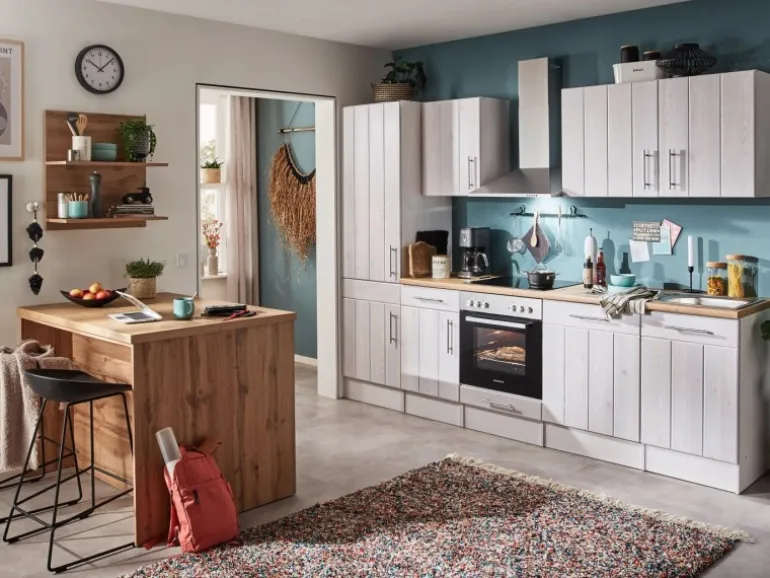Die Anton Landhaus Küchenfamilie hat eine Erweiterung erhalten: Sowohl Küchenzeilen als auch L-Küchen mit einer Breite von 280 cm oder 310 cm sind jetzt auch mit einer Kücheninsel erhältlich. Es gibt zwei Varianten der Landhaus Inselküchen. Bei der ersten Variante sind alle Elektrogeräte in der Küche eingebaut, während die Insel als zusätzliche Arbeitsfläche dient. Die zweite Variante umfasst eine Insel, die mit einem autarken Backofenset und einer Inselhaube ausgestattet ist. Dieses Set besteht aus einem Backofen und einem Induktionskochfeld mit einer Breite von 59 cm. Unabhängig von der Variante kann die Insel sowohl freistehend als auch wandnah aufgestellt werden, was eine individuelle Anpassung an deinen Küchenraum ermöglicht. Ausgestattet mit einer 38 mm starken Arbeitsplatte, Metallgriffen und Soft-Close Scharnieren sorgt die Anton Küchenfamilie für hohen Bedienkomfort und eine lange Lebensdauer.