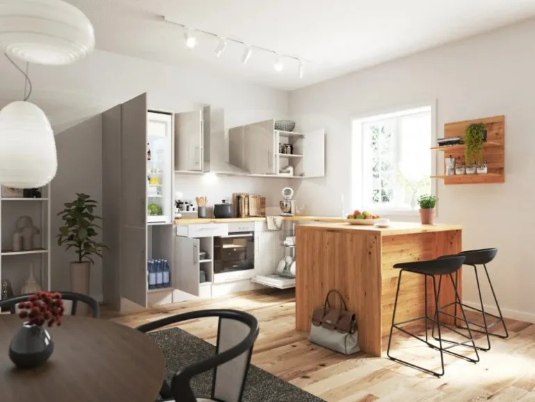 Mit Einbaubackofen EEK: A und Glaskeramikkochfeld, Kaminhaube EEK: B, Einbaugeschirrspüler EEK: E, Einbaukühlschrank EEK: E