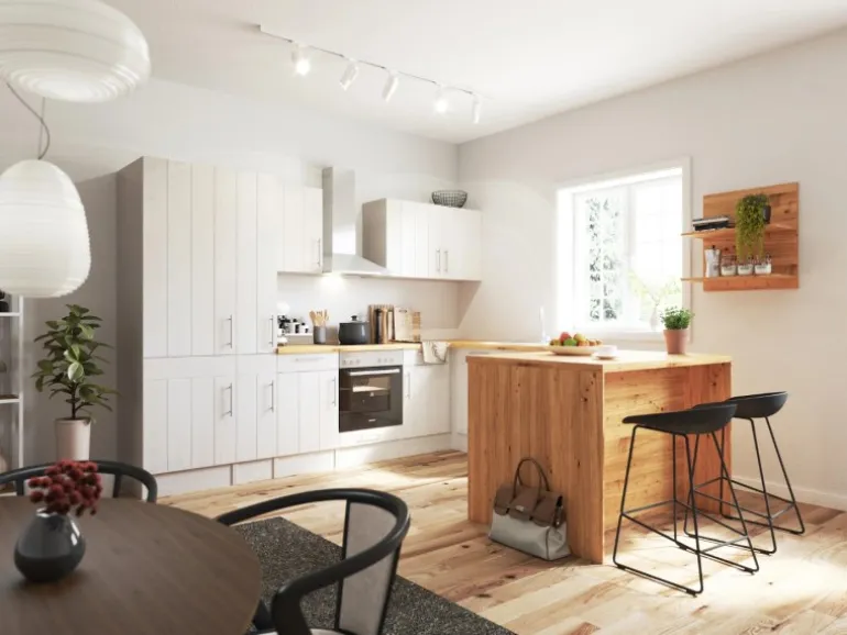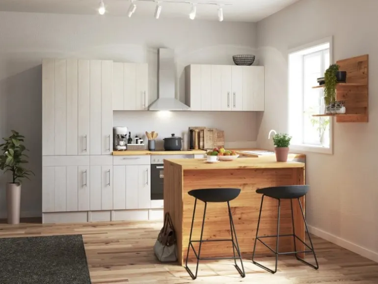 Die Anton Landhaus Küchenfamilie hat eine Erweiterung erhalten: Sowohl Küchenzeilen als auch L-Küchen mit einer Breite von 280 cm oder 310 cm sind jetzt auch mit einer Kücheninsel erhältlich. Es gibt zwei Varianten der Landhaus Inselküchen. Bei der ersten Variante sind alle Elektrogeräte in der Küche eingebaut, während die Insel als zusätzliche Arbeitsfläche dient. Die zweite Variante umfasst eine Insel, die mit einem autarken Backofenset und einer Inselhaube ausgestattet ist. Dieses Set besteht aus einem Backofen und einem Induktionskochfeld mit einer Breite von 59 cm. Unabhängig von der Variante kann die Insel sowohl freistehend als auch wandnah aufgestellt werden, was eine individuelle Anpassung an deinen Küchenraum ermöglicht. Ausgestattet mit einer 38 mm starken Arbeitsplatte, Metallgriffen und Soft-Close Scharnieren sorgt die Anton Küchenfamilie für hohen Bedienkomfort und eine lange Lebensdauer.