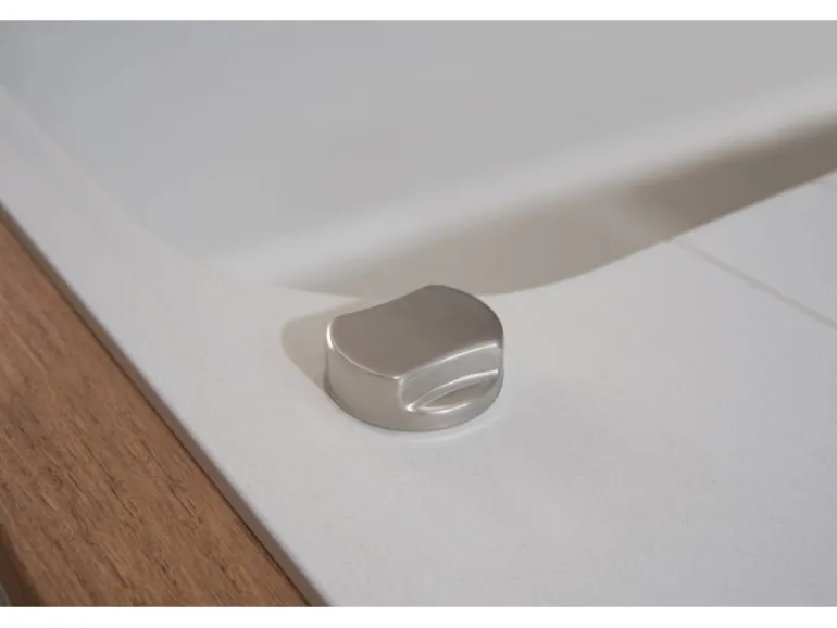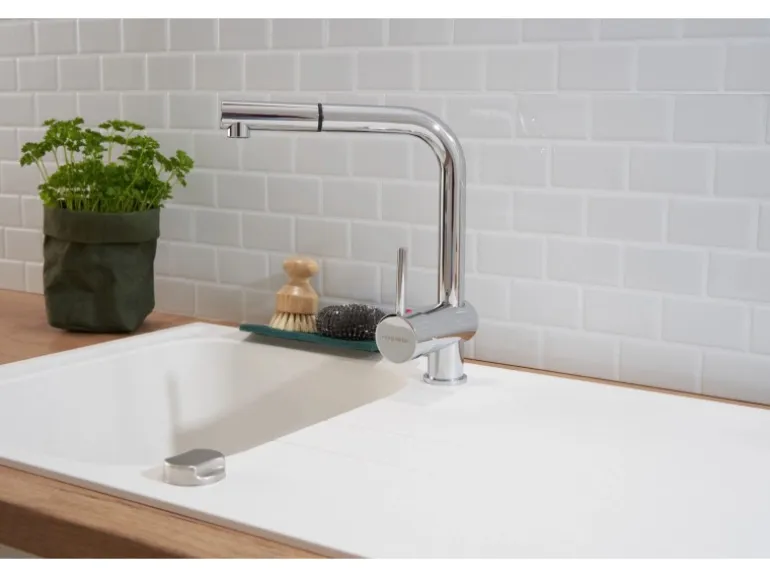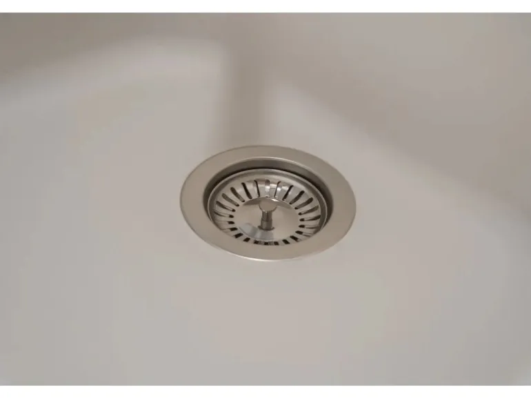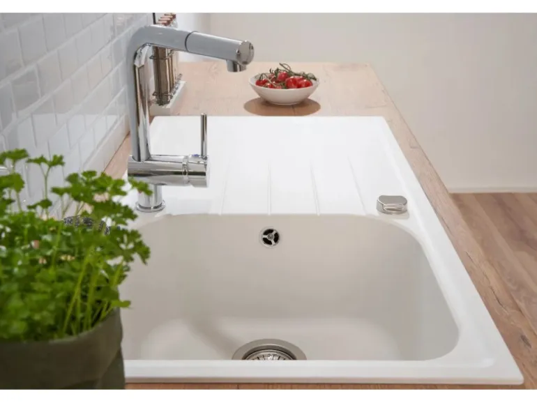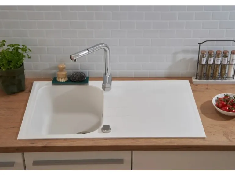 Die Spüle fügt sich harmonisch in jede Küche und ist gekennzeichnet durch ihre stilvolle Optik in Weiß. Die Küchenspüle zeichnet sich außerdem durch ihre eckige Formgebung aus, die das elegante Design der Serie abrundet.