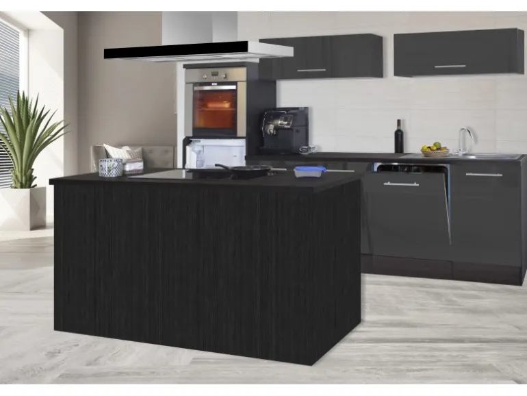 Ausgestattet mit hochwertigen Elektrogeräten lässt diese Küchenzeile keine Wünsche offen. Durch die Kücheninsel, in der auch das Kochfeld enthalten ist, erhalten Sie nicht nur weiteren Stauraum, sondern vor allem zusätzliche Arbeitsfläche. Die leistungsstarke Inselhaube sorgt mit drei Leistungsstufen für perfekten Dunstabzug und beleuchtet das ganze Kochfeld optimal. Der hochgebaute Backofen ermöglicht einen leichteren Zugang, und der integrierte Geschirrspüler erspart Ihnen lästiges Abwaschen per Hand. Neben der Soft-Close-Funktion aller Türen und Auszüge (ausgenommen Kühlschranktür) sorgt die ergonomische Arbeitshöhe von 91 cm für zusätzlichen Komfort.