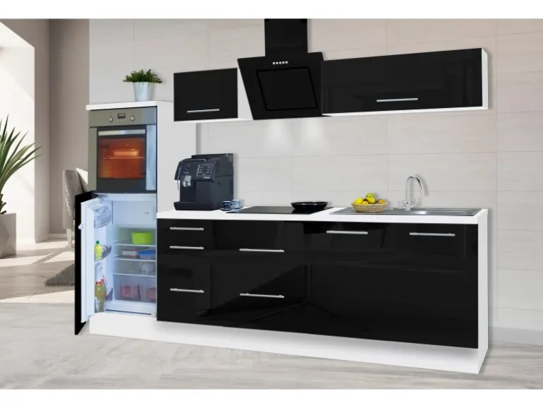 Ausgestattet mit stromsparenden Elektrogeräten lässt diese Küchenzeile keine Wünsche offen. Der hochgebaute Backofen ermöglicht einen leichteren Zugang. Die Kopffreihaube bietet viel Bewegungsfreiraum und erleichtert den Zugriff auf die hinteren Kochstellen. Neben der Soft-Close-Funktion aller Türen und Auszüge (ausgenommen Kühlschranktür) sorgt die ergonomische Arbeitshöhe von 91 cm für zusätzlichen Komfort.