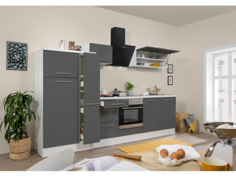 Ausgestattet mit stromsparenden Elektrogeräten lässt diese Küchenzeile keine Wünsche offen. Das Einbauherdset mit Glaskeramikkochfeld und die farblich perfekt integrierte Dunstabzugshaube sorgen für größtmögliches Back- und Kochvergnügen. Die moderne Kopffreihaube bietet viel Bewegungsfreiraum und erleichtert den Zugriff auf die hinteren Kochstellen. In der großen Kühl- und Gefrierkombination finden mühelos all Ihre Lebensmittel und Getränke Platz. Neben der Soft-Close-Funktion aller Türen und Auszüge (ausgenommen Kühlschranktür) sorgt die ergonomische Arbeitshöhe von 91 cm für zusätzlichen Komfort.