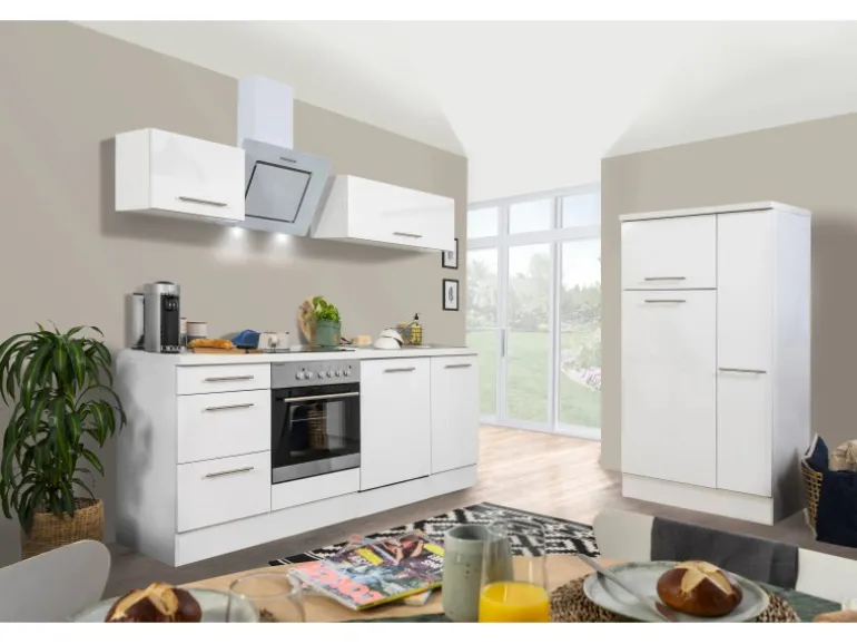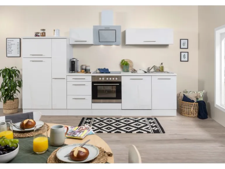 Ausgestattet mit Elektrogeräten lässt diese Küchenzeile keine Wünsche offen. Das Einbauherdset mit Glaskeramikkochfeld und die farblich perfekt integrierte Dunstabzugshaube sorgen für größtmögliches Back- und Kochvergnügen. Die moderne Kopffreihaube bietet viel Bewegungsfreiraum und erleichtert den Zugriff auf die hinteren Kochstellen. In der großen Kühl- und Gefrierkombination finden mühelos all Ihre Lebensmittel und Getränke Platz und der integrierte Geschirrspüler erspart Ihnen lästiges Abwaschen per Hand. Neben der Soft-Close-Funktion aller Türen und Auszüge (ausgenommen Kühlschranktür) sorgt die ergonomische Arbeitshöhe von 91 cm für zusätzlichen Komfort.