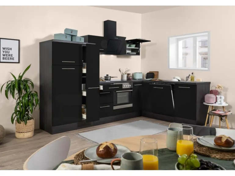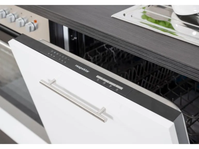 Ausgestattet ist die Küchenzeile mit Elektrogeräten wie Einbauherd, Dunstabzugshaube und einer Kühl-/Gefrierkombination. Das Einbauherdset mit Glaskeramikkochfeld sorgt für größtmögliches Back- und Kochvergnügen. Die moderne Kopffreihaube bietet viel Bewegungsfreiraum und erleichtert den Zugriff auf die hinteren Kochstellen. Der integrierte Geschirrspüler erspart Ihnen lästiges Abwaschen per Hand. Neben der Soft-Close-Funktion aller Türen und Auszüge sorgt die ergonomische Arbeitshöhe von 91 cm für zusätzlichen Komfort.