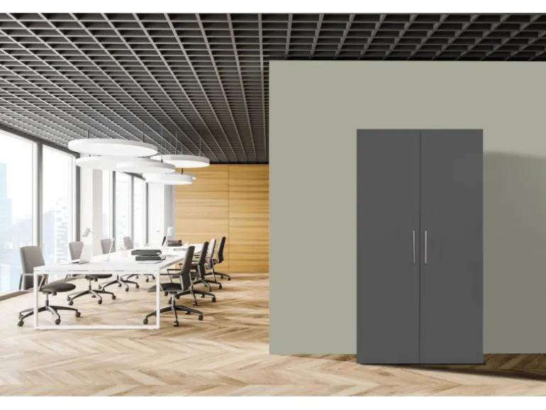 Die matten Türfronten in Grau mit ihren dezenten Metallgriffen verdecken gekonnt die komplette Küchenausstattung und sorgen bei geschlossenen Türen sofort für einen aufgeräumten Anblick. Die ansprechende Optik wird durch eine Innenausstattung in neutralem Weiß abgerundet. Die Oberflächen sind ausgesprochen reinigungsfreundlich und sind daher besonders praktisch.