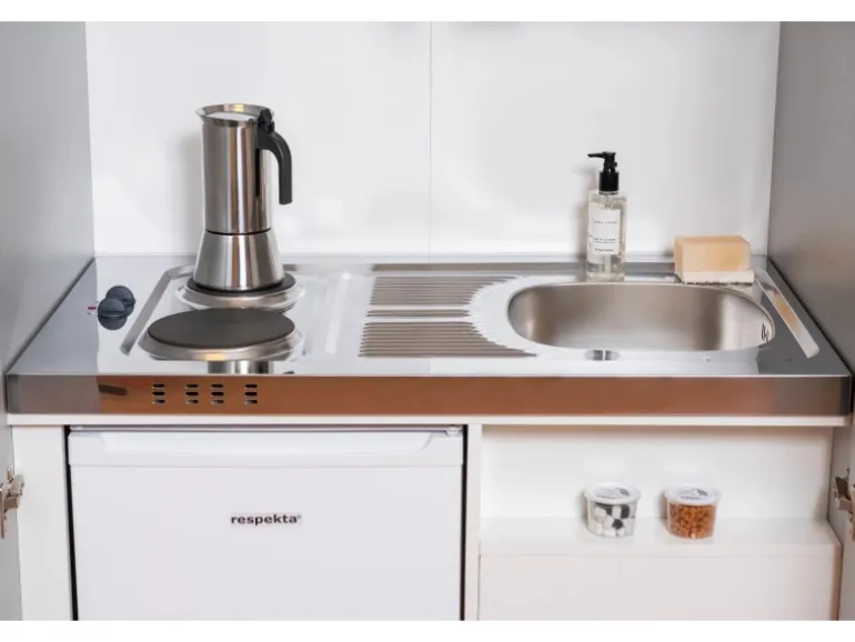 Die Pantryauflage aus Edelstahl beherbergt eine praktische kleine Arbeits- und Abtropffläche, sowie ein Spülbecken mit Ab- und Überlaufgarnitur. Der eingebaute Kühlschrank mit 2** Gefrierfach bietet mit einem Nutzinhalt von 81 Litern ausreichend Stauraum für Lebensmittel und Getränke. Weniger aufwendige Gerichte lassen sich problemlos auf der integrierten Kochmulde mit zwei Kochplatten zubereiten.